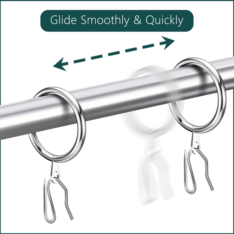 - 3.Wide Application:The combination of the curtain rings with hooks and metal curtain drapery pin hook can widely applied for most kinds of curtains, such as shower curtain, window curtain, french window curtain and so on, classic silver color for long lasting beauty, which is suitable for most home styles, perfect for luxury hotels, restaurant, bar, cafe, meeting room, bedroom, living room etc