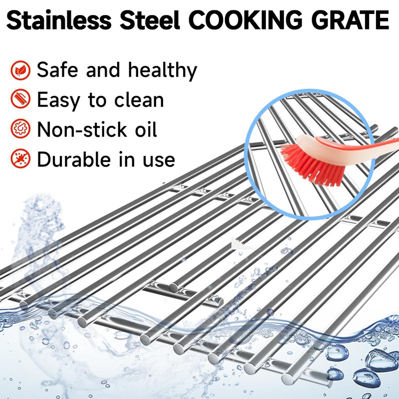 - Excellent Craftsmanship: Made of stainless steel, much longer life than porcelain grill grates, durable & rust-proof, while the smooth surface helps easy cleaning. Narrow gaps between each rod allows you to cook small food without worrying food-falling