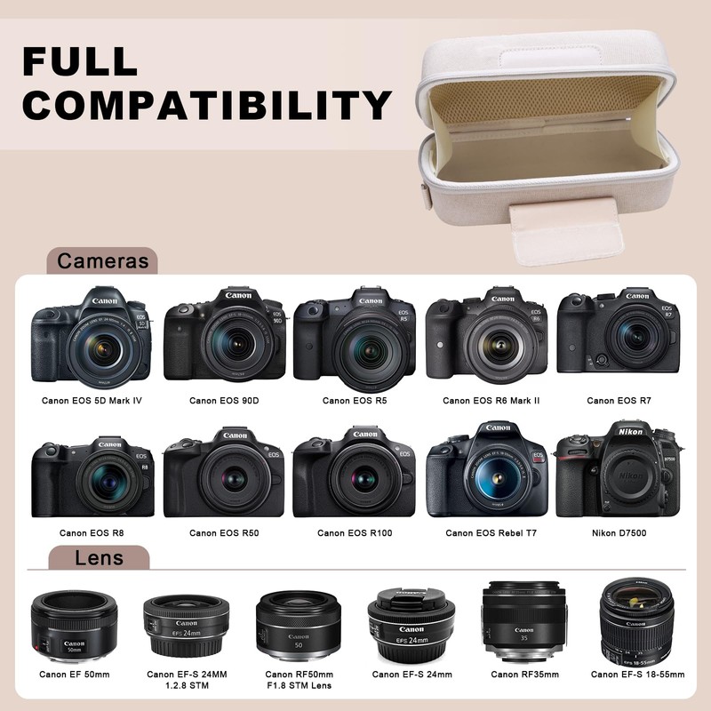 - Camera Case: This carrying camera case is a universal design, perfectly compatible with Canon EOS Rebel R100/R50/T7/ R5/R6 Mark II/R7/R8/90D/5D Mark IV/T100/R10/RP/6D Mark II/SL3, Sony Alpha ZV-E10/a6400/6700/A6100/a6000/7 IV/a7 III/RX100 VII, Nikon D7500/D850 Cameras and 18-55mm Lens.