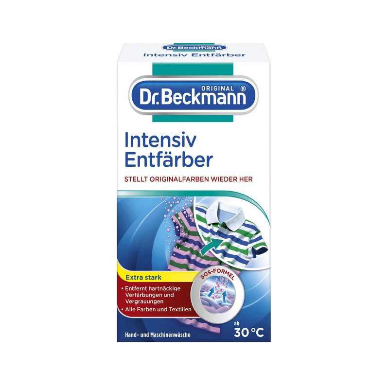 Dr. Beckmann - Intensiv Entfärber 3 in 1. Intensiv-Entfärber entfärbt alle weißen und farbechten bunten Textilien, selbst Empfindliches wie Wolle und Seide. Mit 2 praktischen Portionsbeuteln: 1 Beutel für Handwäsche, 2 Beutel für Maschinenwäsche. Das Dr. Beckmann Versprechen: Für alle Produkte garantieren wir hÃchste Qualität und Wirksamkeit. Wir respektieren unsere Umwelt und gehen verantwortungsbewusst mit Rohstoffen um. Dabei verpflichten wir uns, dass alle waschaktiven Substanzen biologisch abbaubar sind. Wir reduzieren Transportwege durch Produktion in Deutschland bzw. benachbarten EU-Staaten. Alle Dr. Beckmann Produkte sind deshalb unter der EU-Charter-Initiative für nachhaltiges Waschen und Reinigen zertifiziert.