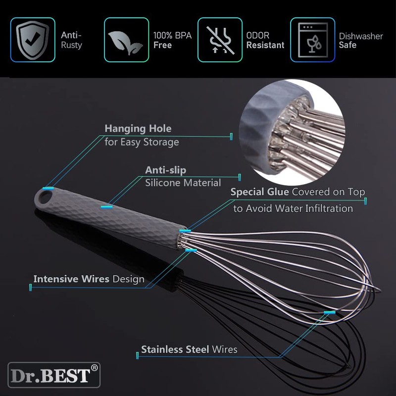 Dr.BEST Stainless Steel Whisk Egg Beater Anti-slip Silicone Handle Comfortable Grip(11 Inch/Gray)
