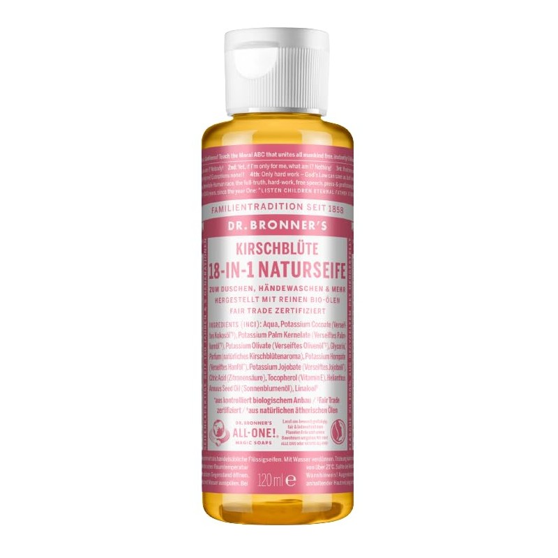 Dr. Bronners | 18-in-1 Natural Soap Cherry Blossom | Organic Liquid Soap | Cherry Blossom | Shower Gel, Hand Soap, Shampoo and Much More | With Organic Coconut, Olive and Jojoba Oil | 120 ml