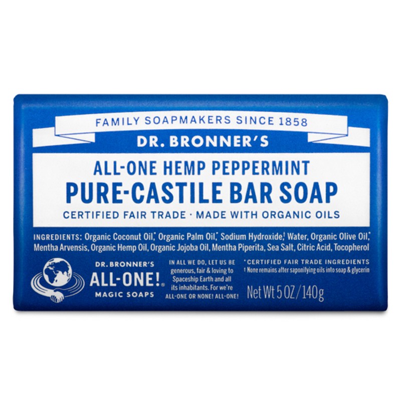 Dr Bronner's most popular scent & with a peppermint burst so pure it tingles! Scented with organic peppermint oil to cool skin, clear sinuses and sharpen the mind. The Peppermint Pure-Castile Bar Soap is made with certified fair trade ingredients and organic hemp oil for a soft, smooth lather that won't dry your skin.