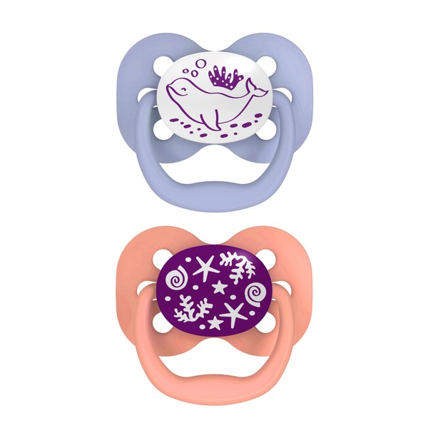 Dr. Brown's Advantage Glow-in-the-Dark Baby Pacifier, Fully Symmetrical Soother with Soft Silicone Bulb, Coral Ocean, 0-6m, BPA Free, 2 Pack