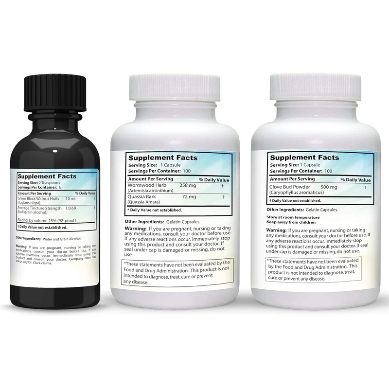 - 3 SYNERGISTIC HERBAL COMPOUNDS - Dr. Clark Store intestinal cleanse kit is armed with Identity checked and Purity tested supplements: Original GREEN Tincture from Young Black Walnuts, Freshly Milled Wormwood and Freshly Ground Cloves in Pure Capsules - Helps maintain Optimum Intestinal Function*