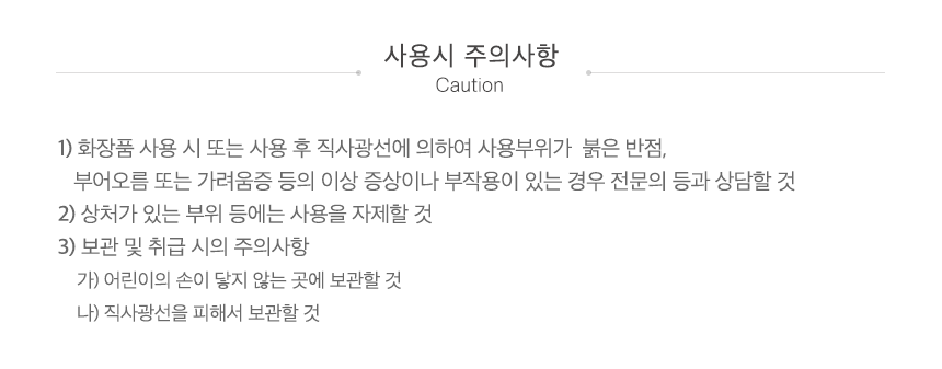 - precautions for use: If you experience any abnormalities such as red spots or swelling after using the cosmetic, stop using it and consult a dermatologist or customer service representative before continuing to use it.