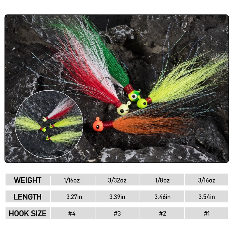 - Unique Combination: A combination of Ball Head and Bucktail hair, incorporating the advantages of all other jigs, ensure maximum productivity, giving anglers the best chances of a successful catch.