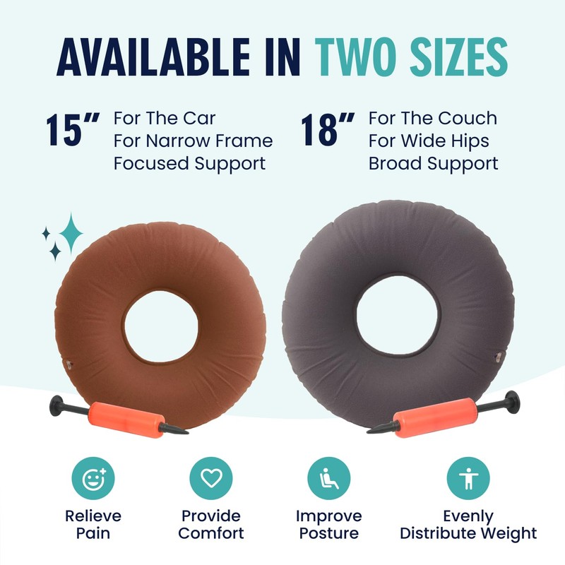 - Two Sizes For Fit And Travel: Our Donut Cushion comes in 15” and 18” models, because we know sometimes one size DOESN’T fit all. We recommend the smaller cushion for the office or travel - great for the car or airplane seats! The larger one is perfect for the couch, or for those with wider hips. Perfect for users who suffer from bedsores, new mothers with postpartum pain, or exceptionally uncomfortable office chairs. Can even be used when lying down in bed!