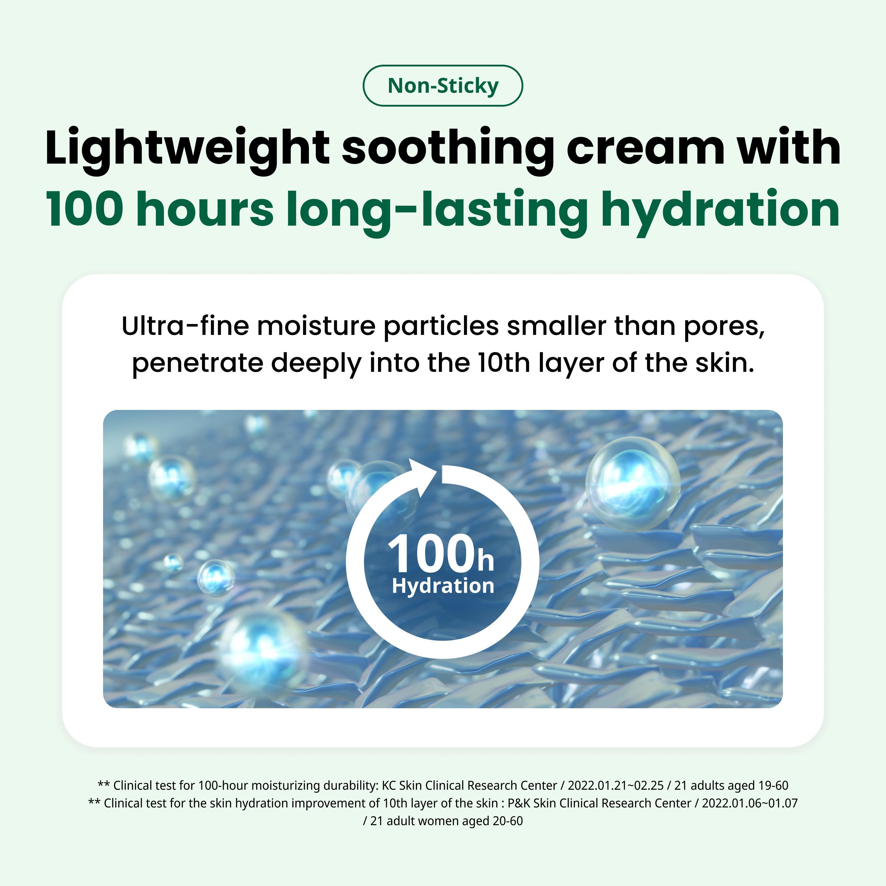 Provides 100 hours of lasting hydration with increasing skin moisture over time; smooth, non-sticky texture absorbs comfortably. Soothes daily irritations such as UV and physical stimuli, lowering skin temperature with a refreshing calming effect. Passed skin irritation, sensitive skin suitability, acne-prone skin suitability, and low irritation tests for safe use.