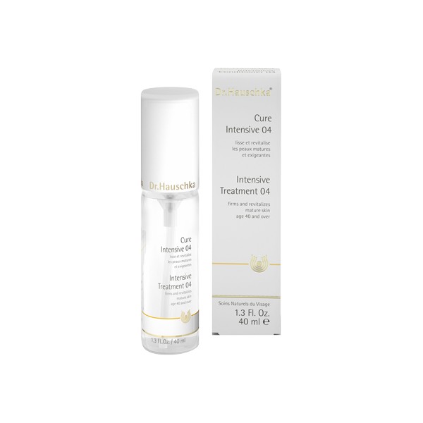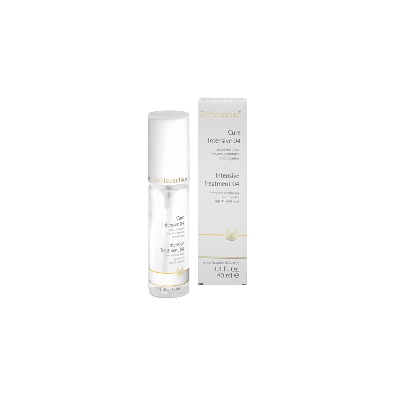 INTENSIVE TREATMENT 04 FOR MATURE SKIN 40+Dr. HauschkaIntensive Treatment 04 visibly refines lines, enhances the skin's tone and elasticity, and helps visibly smooth wrinkles.Visibly refines lines and diminishes the appearance of wrinkles. Rhythmitised dilutions of blue tourmaline, amber and gold and hydrating extracts of white lily, gingko and hawthorn work with your skin's natural rhythms to leave it feeling soft, radiant and beautiful. [LIQUID]