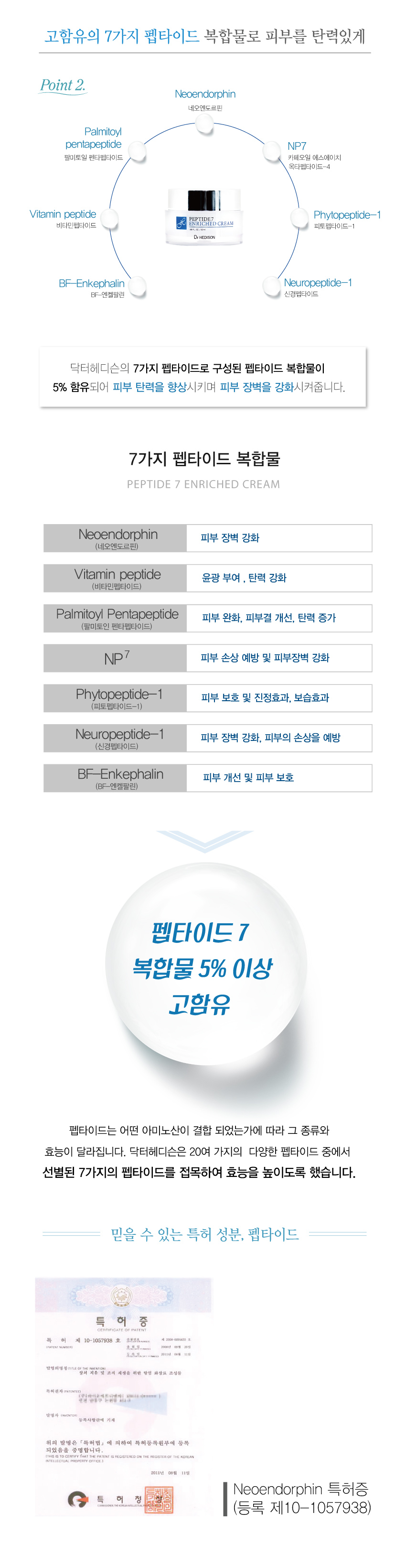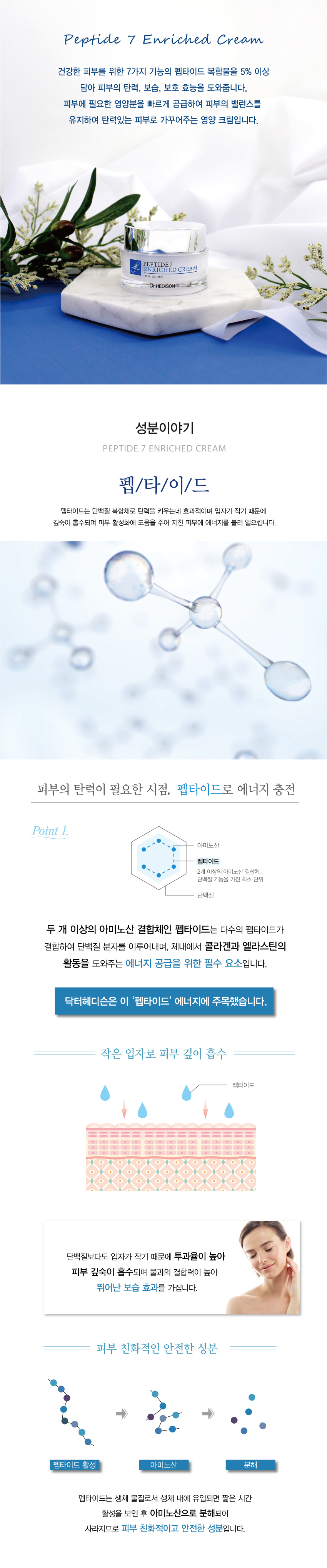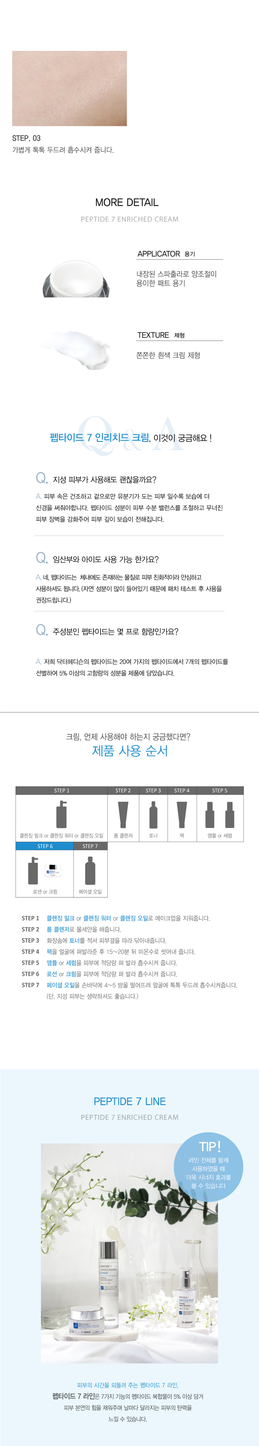 - Product main specifications: 7 types of peptide complex and adenosine increase skin elasticity and help improve wrinkles. Peptides have smaller particles than proteins, have a high skin penetration rate, are absorbed deeply, and have a high affinity for water, allowing for excellent skin care.