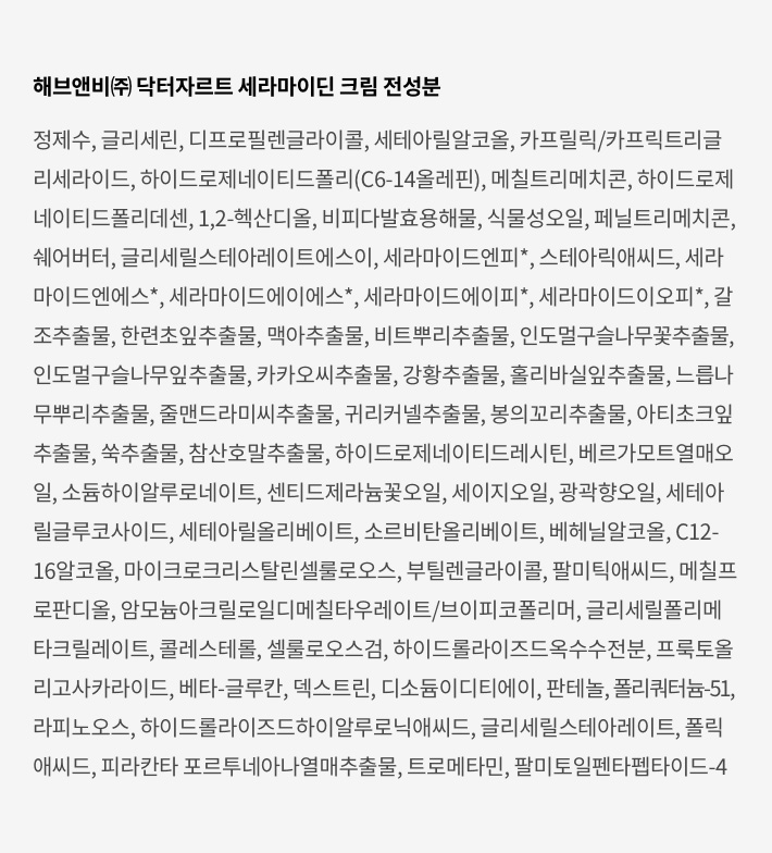 - All ingredients: Purified water, glycerin, dipropylene glycol, cetearyl alcohol, caprylic/capric triglyceride, hydrogenated poly(C6-14 olefin), methyl trimethicone, hydrogenated polydecene, 1,2 -Hexane diol, bifida fermentation lysate, vegetable oil, phenyl trimethicone, shea butter, glyceryl theate SE, ceramide NP*, ceramide EOP*, ceramide NS*, ceramide AS*, ceramide AP*, Stearic acid, kelp extract, horsetail kelp extract, nasturtium leaf extract, malt extract, beet root extract, neem flower extract, neem leaf extract, cacao seed extract, turmeric root extract, holy basil leaf extract , Sugar elm root extract, cockscomb seed extract, oat kernel extract, honeysuckle tail extract, artichoke leaf extract, vulgaris mugwort extract, Coral horse extract, Pyracantha portuneana fruit extract, hydrogenated lecithin, bergamot oil, sodium. Hyaluronate, scented geranium flower oil, salvia oil, fragrant oil, cetearyl glucoside, cetearyl olivate, sorbitan olivate, C12-16 alcohol, behenyl alcohol, microcrystalline cellulose, butylene glycol. Cole, palmitic acid, methyl propanediol, ammonium acryloyldimethyl taurate/V picopolymer, glyceryl polymethacrylate, cellulose gum, cholesterol, hydrolyzed corn starch, fructooligosaccharide, Beta-Glucan, Disodium EDTA, Dextrin, Panthenol, Polyquaternium-51, Raffinose, Hydrolyzed High Aluronic Acid, Folic Acid, Glyceryl Theearate, Tromethamine, Palmitoyl Penta Peptide- 4