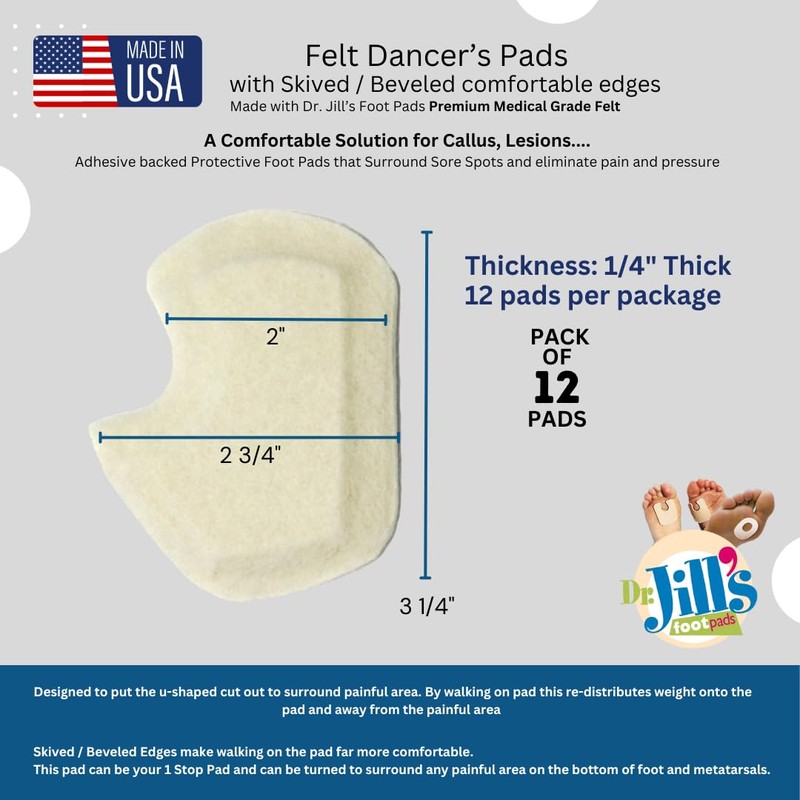 Dr. Jill's Foot Pads, Latex Free, YJ30-4055, Sesamoid Pad Skived 1/4" Felt -Right- (12 Pack) Dancers Pad