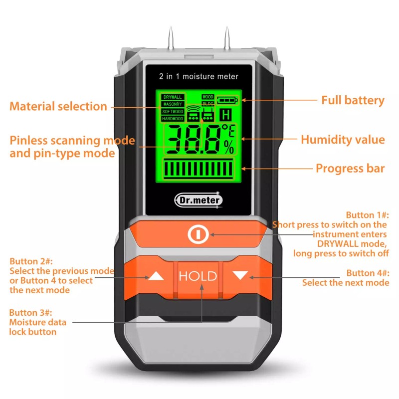 - ▶ 【2-in-1 Moisture Meter】The 2-in-1 Dr.meter moisture meter offers ideal dual functions of pin-type and pinless scanning in one. The pinless scanning mode with non-invasive measurement is ideal for high-end wood and building materials. The pin-type mode with faster response and higher accuracy is great for all kinds of wood and building materials.