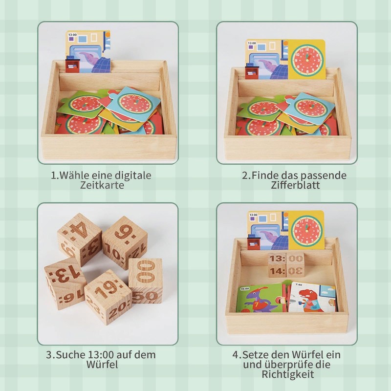 - MONTESSORI TOY: this toy contains 5 wooden cubes, 20 puzzle cards, a wooden base and a watch cover, designed for children aged 3 4 5 6. With high-quality workmanship and endless fun, it ensures a fun playtime