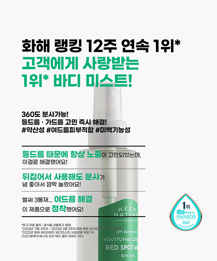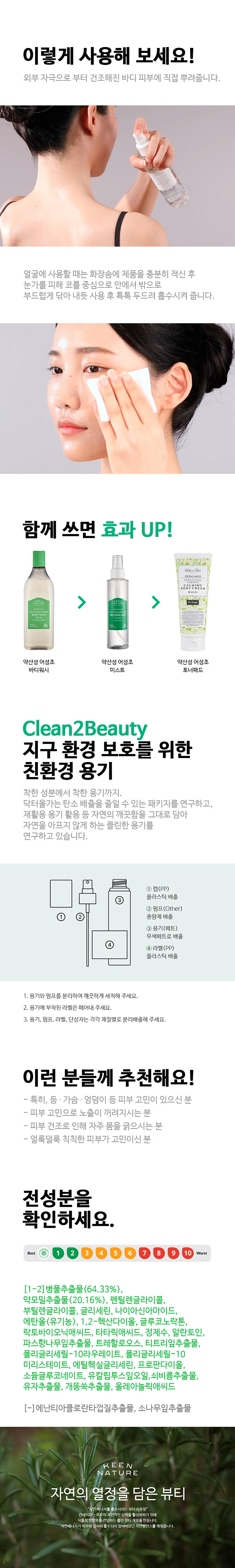 | 사용방법 | 1) 외부자극으로부터 건조해진 바디피부에 직접 뿌려 줍니다. 2) 얼굴에 사용할 때는 화장솜에 제품을 충분히 적셔 눈가를 피해 코를 중심으로 안에서 밖으로 부드럽게 닦아 내듯 사용 후 톡톡 두드려 흡수 시켜 줍니다. |