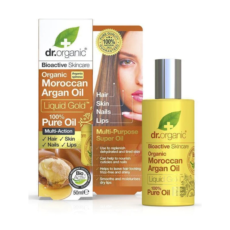Dr Organic Liquid Gold Pure Argan Oil is a multi-action, multi-purpose "super food" for the Hair, Skin, Nails and Lips delivering a moisture repairing, cell regenerating, nourishing and balancing action unique to this precious nut and kept secret by Moroccan women for centuries.