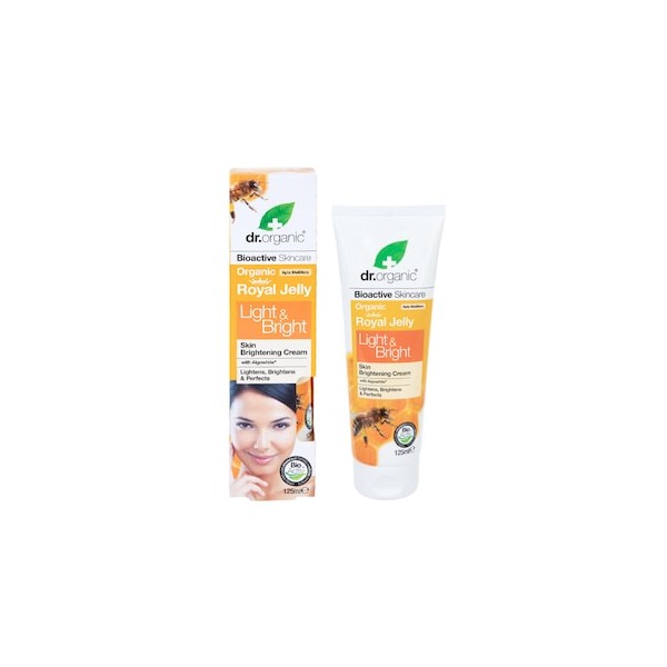 Dr Organic Royal Jelly Light & Brightening skin care cream is a blend of bioactive, natural and organic ingredients. A highly effective cream formulated to naturally lighten skin complexion or skin tone over time infused with Organic Royal Jelly, Algowhite, Aloe Vera Juice, Sweet Almond Oil, Liquorice Extract, Bearberry Extract, Mulberry Extract, Red Clover, Heather, Honey and Propolis. This bioactive cream helps to stimulate cellular renewal, encouraging the reduction of melanin; it improves natural skin exfoliation, eliminating pigmented scales. Brightening the overall complexion of the skin, lightening the appearance of blemishes, scar and damage leaving clearer, smoother skin. Regular usage of this skin creams may helps in correcting acne, blemish, damaged skin, scars and also acts as a pore refiner and enhances natural beauty.