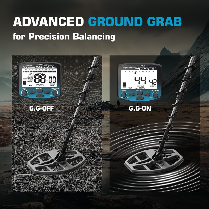 - 【EXCLUSIVE GROUND BALANCE FUNCTION】This gold detector features a unique ground balance function, automatically adapting to mineralized soil, wet sand, or rocky terrain. With 50% less interference, it ensures stable performance and minimizes false signals, perfect for challenging environments.