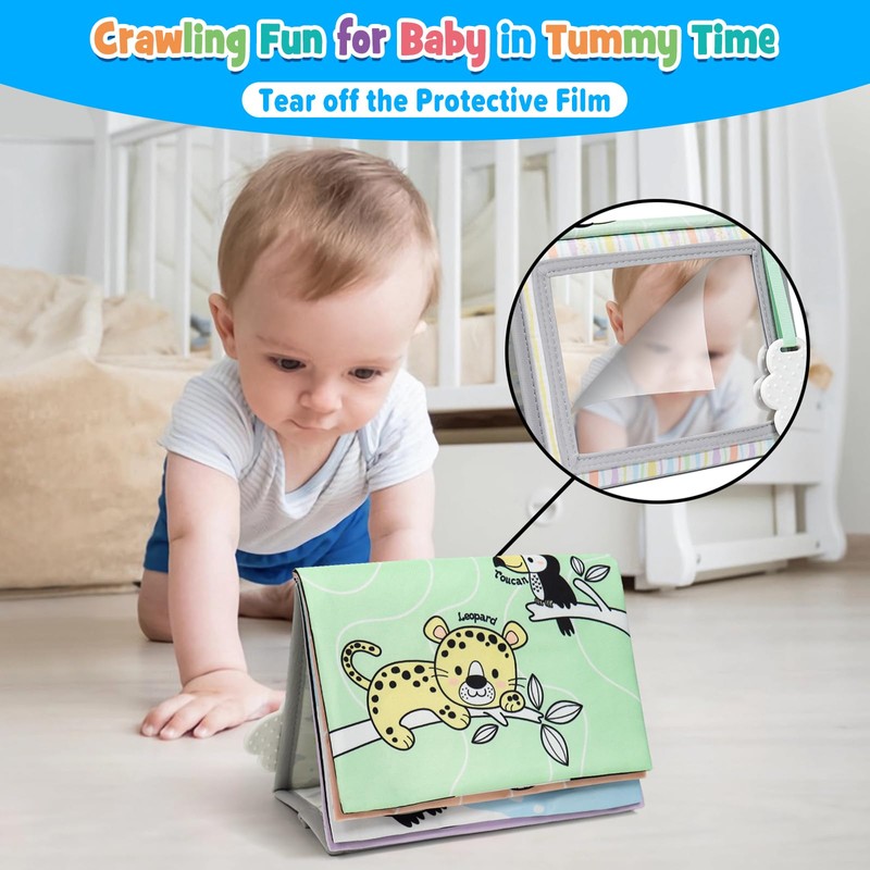 - Flip Over Soft Book: The soft cloth book is stitched on the baby-safe mirror with a BPA free silicone teether. It stands stable on the floor, encourage baby to enhance muscle strength. Flip over design helps baby develop motor skills