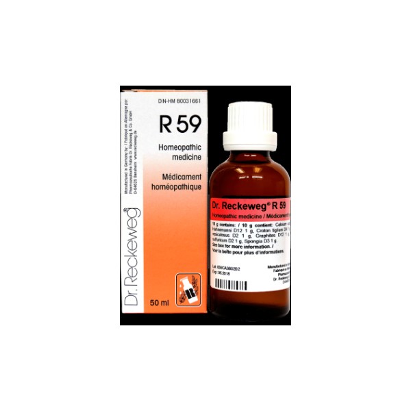Established by Dr. Heinrich Reckeweg’s original research and manufactured according to rigorous quality control standards in Germany, R combinations are recommended in Canada by Naturopathic Doctors for their quality and the results experienced by the people taking them. R59 comes in a convenient and active liquid form, containing a proprietary blend of several homeopathic herbs including Calcium carbonicum Hahnemanni D12, Croton tiglium D4, Graphites D12, Spongia D3, and other ingredients to support the body’s natural and healthy processes. [LIQUID]