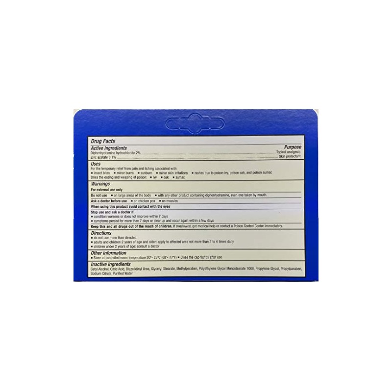 - CONTAINS: Diphenhydramine HCl 2%, topical analgesic; Zinc acetate 0.1%, skin protectant