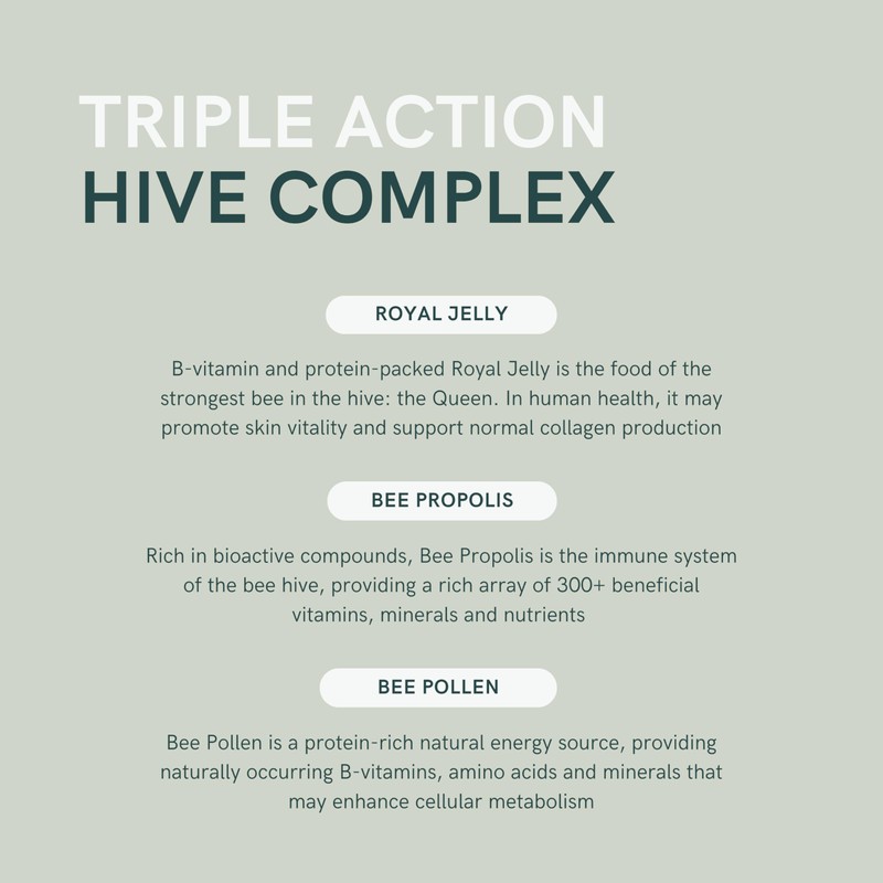 - MEET YOUR HIVE HERO: Combining our three core ingredients - Bee Propolis, Royal Jelly and Bee Pollen - Hive Hero is maximum potency triple-action formula that provides the full spectrum of high strength hive-derived essentials in one daily supplement.