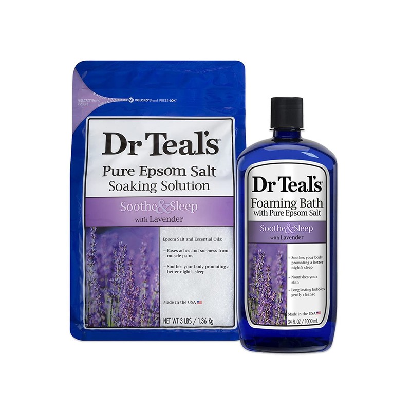 - Soothe sore muscles with 2 cups of Dr Teal's Epsom salt. Soak for 20 minutes 2 times per week while pouring a generous amount of Dr Teal's foaming under running water for a relaxing bubble bath experience.