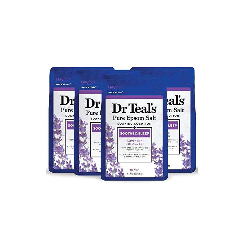 Dr Teal's Sal de Epsom pura, calma y duerme con lavanda, 3 libras (paquete de 4) (el embalaje puede variar) y remojo para dormir con sal pura de Epsom, melatonina y mezcla de aceites esenciales, 3