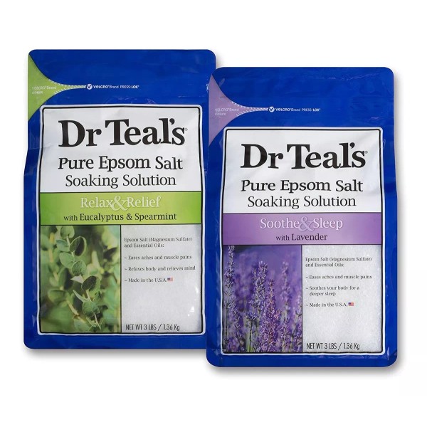 Fabricado con sal de Epsom pura (sulfato de magnesio USP) y aceites esenciales naturales, las sales de Epsom para baño Dr Teals proporcionan una variedad de beneficios.; Alivia los dolores y las molestias: El baño de sal de Epsom Dr Teals es una manera fácil y accesible de calmar los músculos adoloridos después de entrenamientos, ayudar a acelerar la recuperación y volver al juego de la vida. Vierte 2 tazas de sal de Epsom en un baño caliente y toma un baño durante 20 minutos o, crea una pasta relajante muscular disolviendo una cucharadita de sal pura de Epsom Dr Teals en una taza de agua caliente y frota en los músculos adoloridos.; Bolsa resellable: Nuestras bolsas cuentan con un cierre de velcro para hacer que resellar tus sales de Epsom sea más fácil, más rápido y más resistente que nunca.; Régimen rápido y fácil: Calma los músculos adoloridos con 2 tazas de sal de Epsom Dr Teals. Toma un baño de tina durante 20 minutos 2 veces por semana. Dr Teals - Paquete de solución de baño de sal de Epsom 1 Relax y alivio de eucalipto y menta de 3 libras y 1 Calma y sueño de lavanda de 3 libras. Todos nuestros productos estan en inglés SKU 1042237594