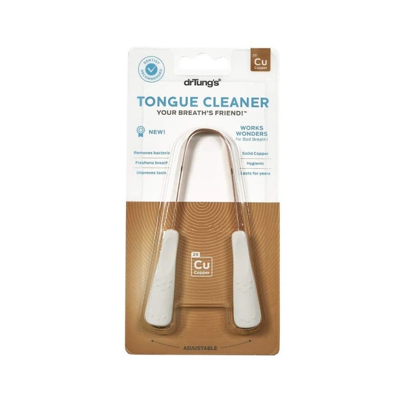 The BEST remedy for bad breath is now available in copper! Copper is not only antibacterial but is also known for its antimicrobial qualities. The Science of Ayurveda considers copper one of the important materials to be used for tongue cleaning. The curved cleaning edge removes bacteria and soft plaque in seconds! Cleaning your tongue is comfortable, quick and effective with DrTung's. Modern research confirms that tongue cleaning is the best way to remove bacteria that cause bad breath. Tongue cleansing also helps improve taste, remove the coating on the tongue and slow the growth of plaque. DrTung's use high-grade copper because it is impervious to bacteria, and is more comfortable and gentle on the tongue than plastic.