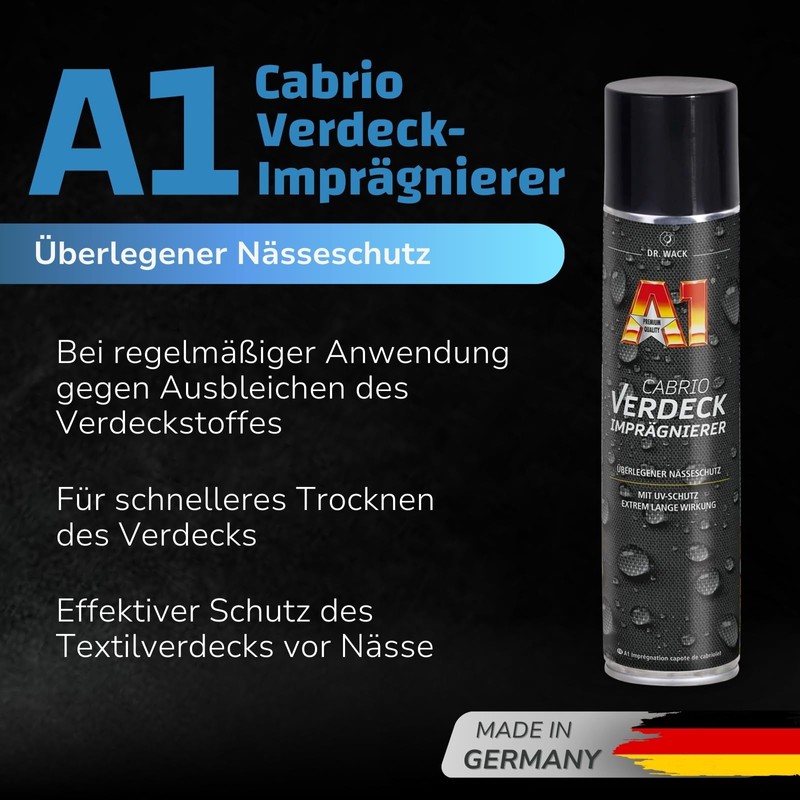 • The A1 convertible soft-top impregnator prevents rain from soaking in and also ensures that the soft top dries quickly.