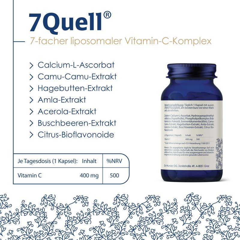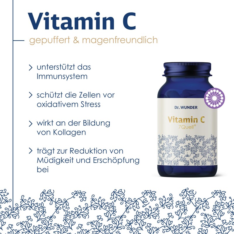 Dr. Wunder 7Quell Vitamin C is a highly effective vitamin C complex that provides the body with vitamin C 7 times. It consists of liposomally formulated, stomach-friendly vitamin C (calcium L-ascorbate) in combination with 6 other selected vitamin C-rich plant extracts. Each capsule contains a full 400 mg of vitamin C.