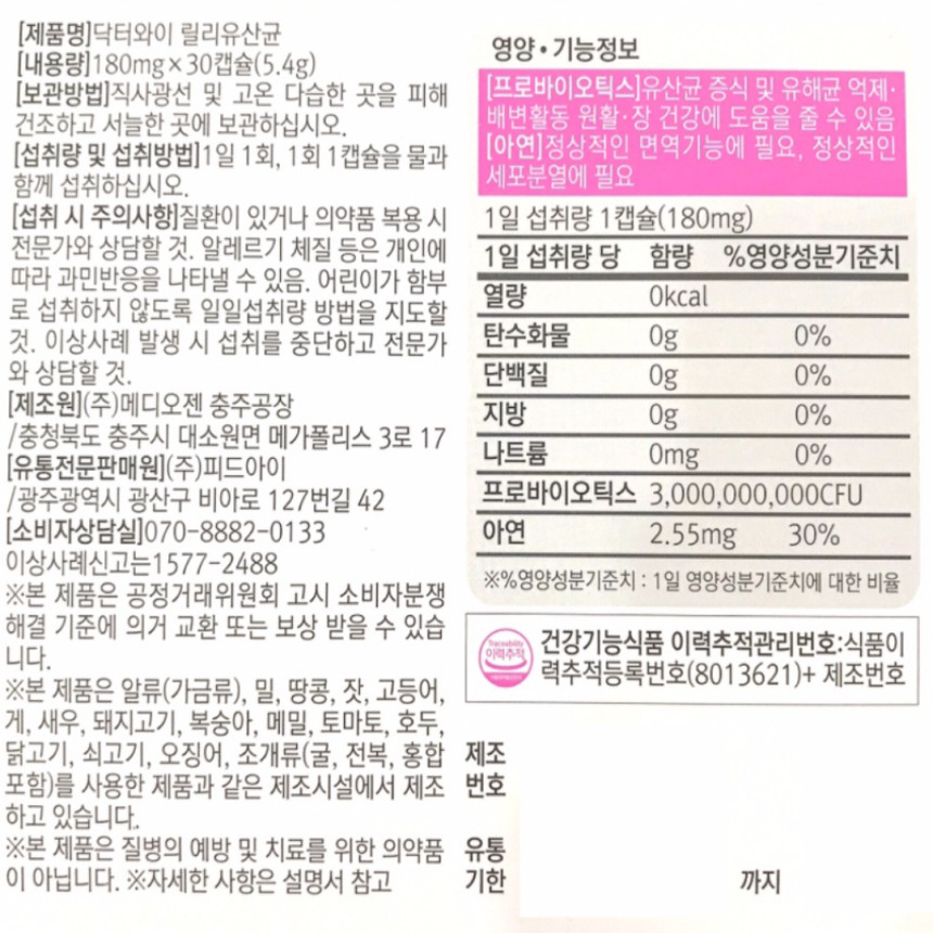 Dr. Y Lily Lactobacillus Probiotics & Zinc 180mg x 30 capsules x 4 boxes, 4 month supply / 닥터와이 릴리 유산균 프로바이오틱스&아연 180mg x 30캡슐 x 4박스 4개월분