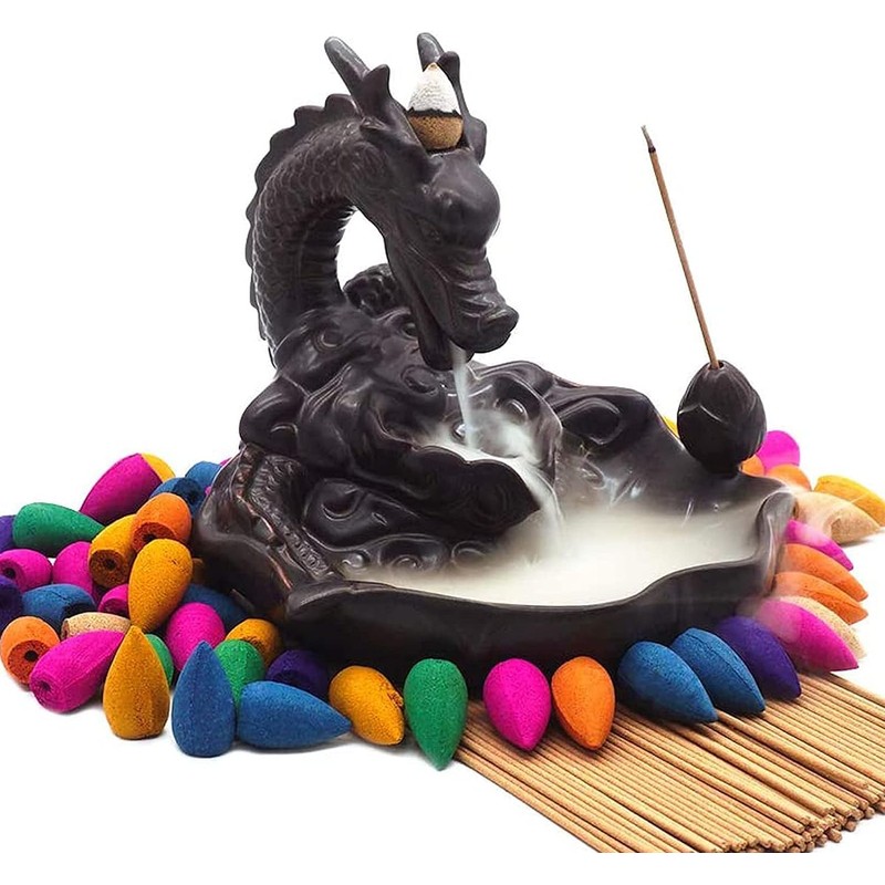 - Incense Burner Set - This item includes 1 dragon-shaped incense burner, 45 backflow incense cones with mixed scents, and 50 incense sticks that are 10 centimeters long