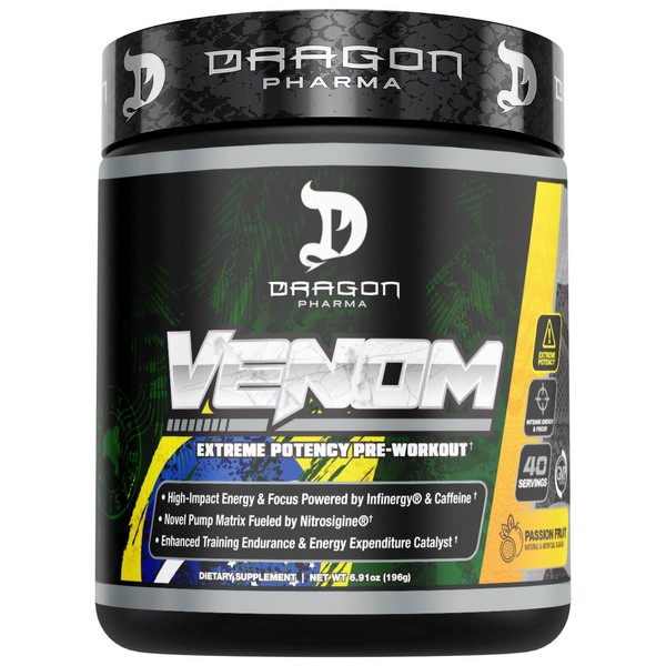 DRAGON PHARMA Venom Extreme Potency Pre-Workout, Laser Sharp Focus + Energy, Intense Performance, Proven Ingredients for Enhanced Vasodilation & Endurance (40 Servings, Passion Fruit)