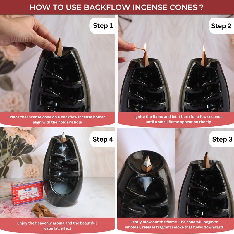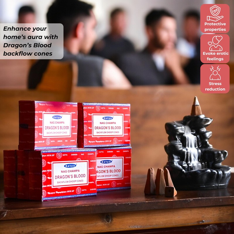 - Incense Fountain: Dragon's Blood incense waterfall cones are used for creating aromatic smoke fountain in the special burner meant for such cones.