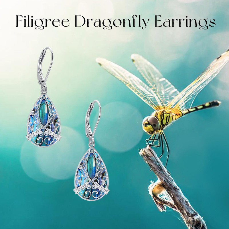Dragonfly Filigree Earrings Sterling Silver Dragonfly Teardrop Abalone Shell Drop Dangle Earrings Jewelry for Women