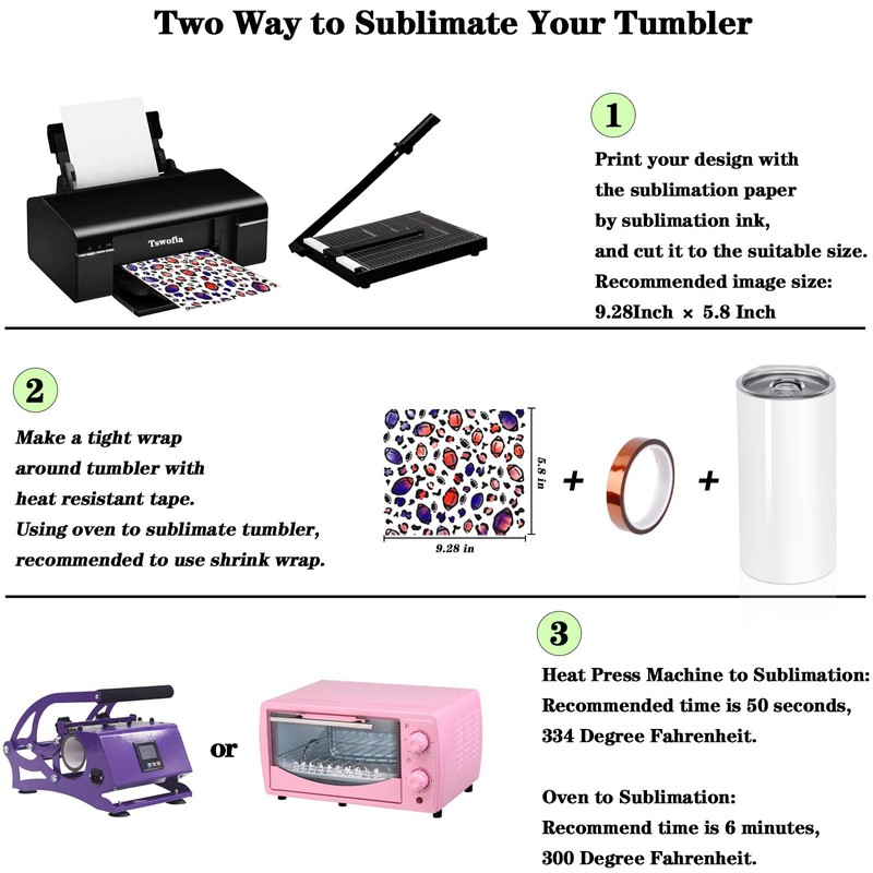 - 【TWO WAYS TO SUBLIMATE】If you choose heat press machine to sublimate your tumblers, set the temperature to 350℉, 50 seconds, then rotate to the othr sides for 50S ; If you use oven, set the temperature to 300℉-340℉ for 4-5 minutes, turning the cup every one minute to make it evenly heated.