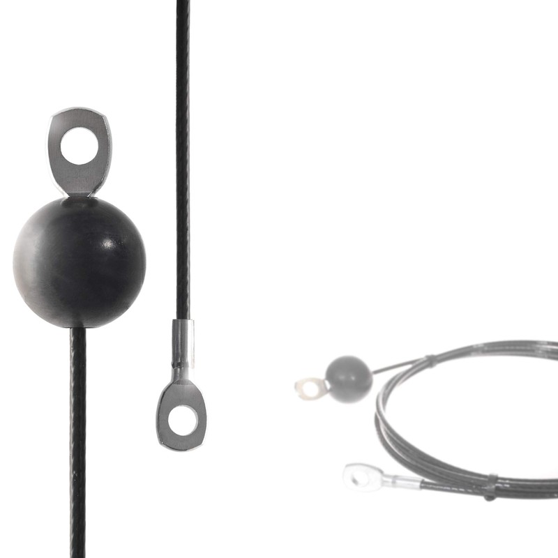 Our black coated steel cables comply with European standard DIN 12385-4 and have a rope classification of 7x19, which is 7 strands with 19 wires each. The high-quality cable made with black PA 12 nylon sheath has been specially designed for fitness equipment and pulleys. Thanks to the robust and tight-fitting, 1 mm thick coating, the wire rope is protected inside and has increased durability. The steel cable can be used on various lat pulls, cable pulls and weight stations on the tower for professional and private use as a replacement rope. The steel cable is pressed at both ends with a small eyelet terminal; in addition, the rope is equipped with a ball stopper that serves as a stop buffer. This ball stopper can also be omitted.