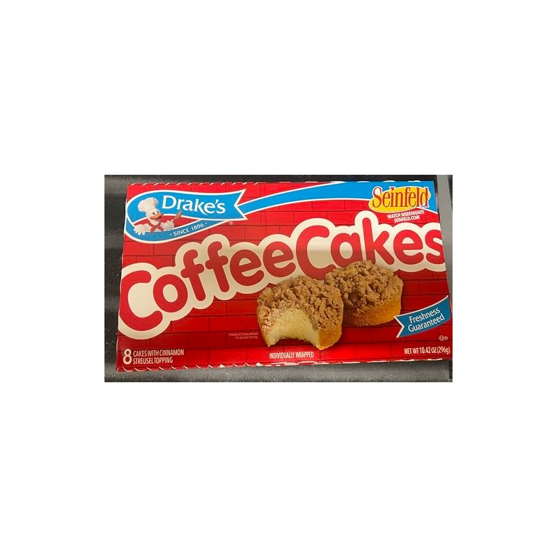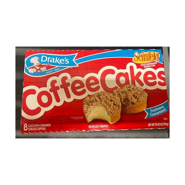 Includes 2 boxes of Drake's Coffee Cakes, containing 8 individually wrapped coffee cakes per box 16 individually wrapped coffee cakes Drake's Cakes original Coffee Cakes are often imitated, never duplicated These classic round Drake's coffee cakes are topped with a generous supply of sweet, cinnamon-flavored streusel Some people say it makes a perfect after-dinner treat or after-school goody for the kids; that is, if you're willing to share Drake's Coffee Cakes are now individually wrapped so they are ready to throw in your purse, book bag, gym bag, desk drawer, nightstand, coat pocket, toiletry case or wherever you need them so you can have easy access to a quick coffee cake fix Kosher certified by the Orthodox Union