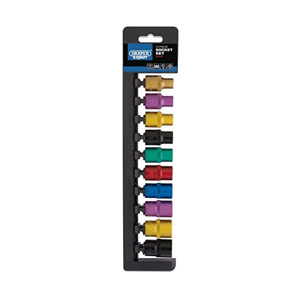 Draper 50493 1/2-Inch Square Drive Metric Coloured Socket 10 Piece Rail Set