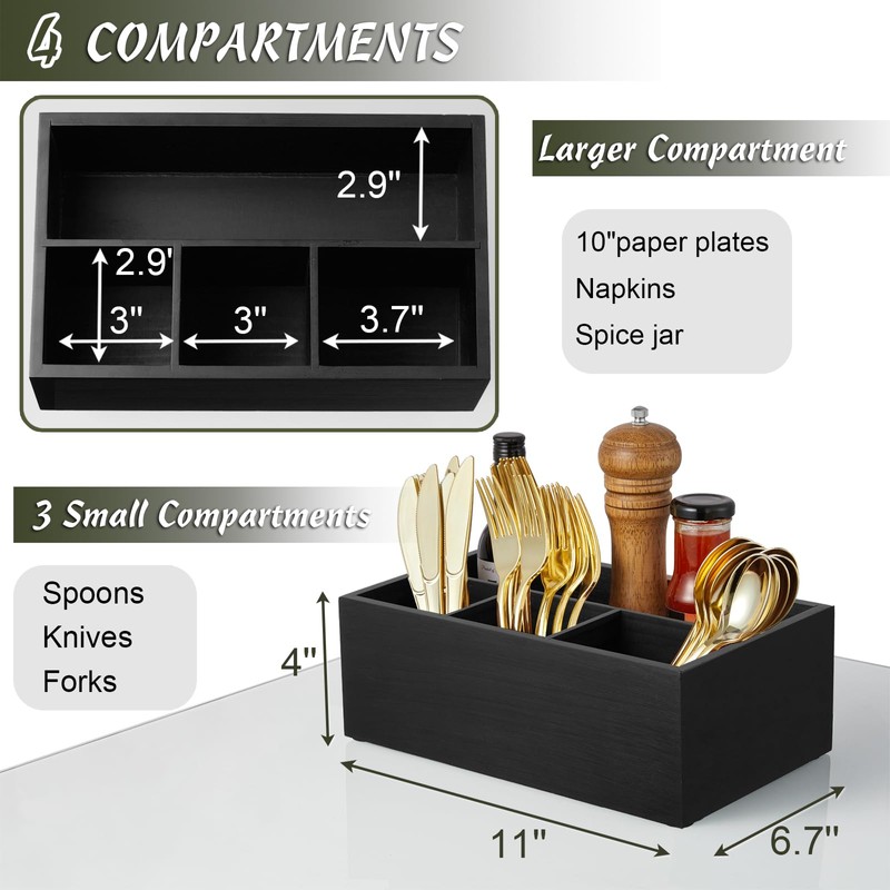 - Paper Plate Dispenser 4 in 1: Utensil caddy's main compartment fits 10" paper plates in large quantities and the 3 smaller slots are perfect for spoons and forks, knives, and small cups. Great use for keeping all serving items in one place and everything is within reach