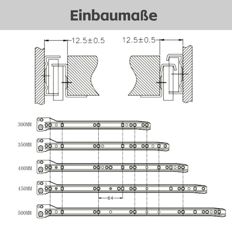 - Sizes: drawer runners length: 450 mm, installation width: 12.5 mm, colour: white. Installation condition: cabinet depth > length of the pull-out rails + 3 mm.