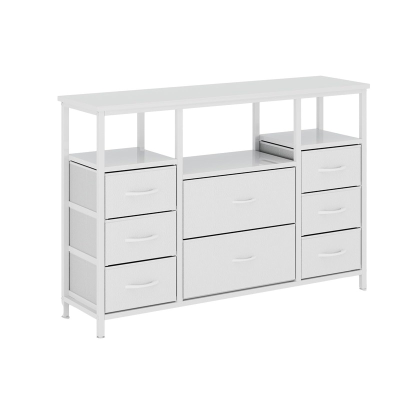 DRAWERHOM 8-Drawer Fabric Dresser TV Stand for 40" TV - Sturdy Steel Frame & Wood Top Chest of Drawers, Lightweight Storage Organizer for Bedroom, Closet, Entryway (43.31" Wide, White)