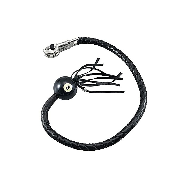 - [Beautiful Appearance]-Black hand-braided leather get back whip features a black pool ball with the number 8 on it. The black fringe design is very eye catching especially while you're riding. Equipped with stainless steel quick-release clip, leather whip can be attached to either the brake or clutch lever. The whip will hang straight from the handlebar while idle and move freely in the wind while moving.