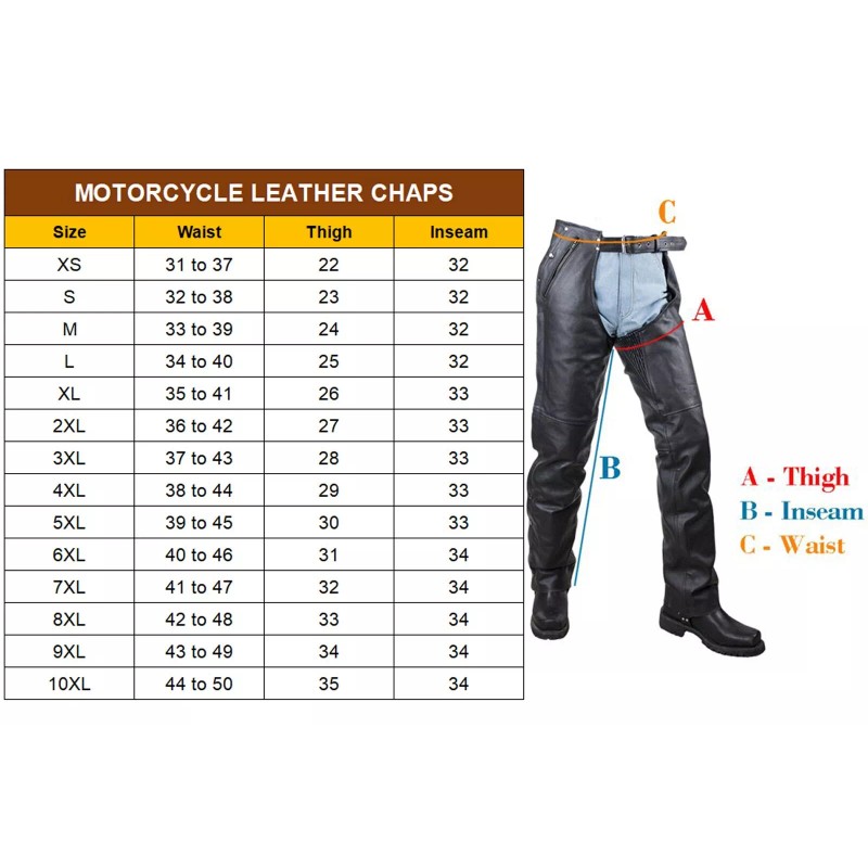 - Quality and Durable Hardware - Stainless belt buckle, corrosion resistant rivets, rust free zippers and snap buttons make the biker chaps durable and serve you longer. YKK zipper known for longevity and durability. The black leather chaps for men are suitable for touring, street, and cruiser riders.