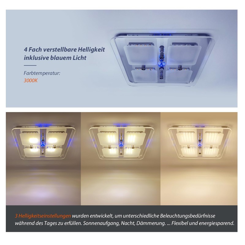 This 12V ceiling light is designed with a blue mood light around the built-in switch and three different levels of warm white light that meet the different lighting requirements over the course of a day. Sunrise, Dusk and Night... It offers a flexible solution for energy saving. It leaves a clean finish after installation as polished screw caps are included to cover the screw holes.