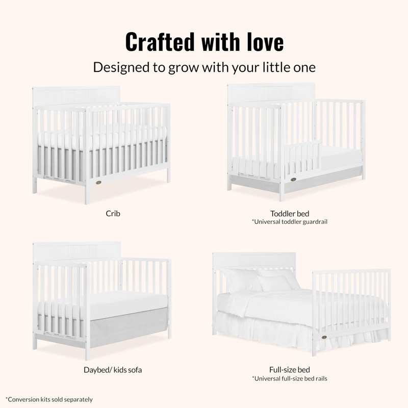 - 5-in-1 CONVERTIBILITY: Transitions seamlessly from a crib to a toddler bed, daybed, and full-size bed with a headboard and footboard (conversion kits sold separately).
