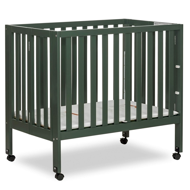 Dream On Me Jett Mini Folding Baby Crib in Olive, GreenGuard Gold & JPMA, Lightweight & Portable, Patented Flat Folding System for Small Spaces & Travel, 1.5” Mattress Pad, 3 Heights, Safe Wheels